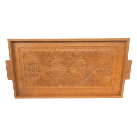 Plateau de service rectangulaire en bois massif sculpté, dimensions 52,3 x 27,8 cm.