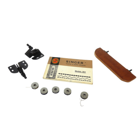 Livret d'instructions de la machine à coudre Singer 807 + 5 canettes, 2 charnières et une planchette.