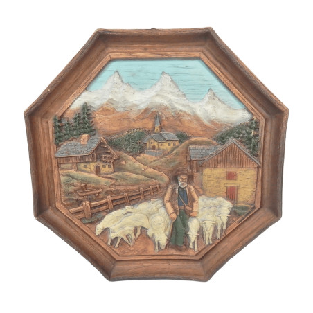 Cadre octogonal en résine imitation bois avec effet relief représentant un village de montagne avec au premier plan un berger et ses moutons.